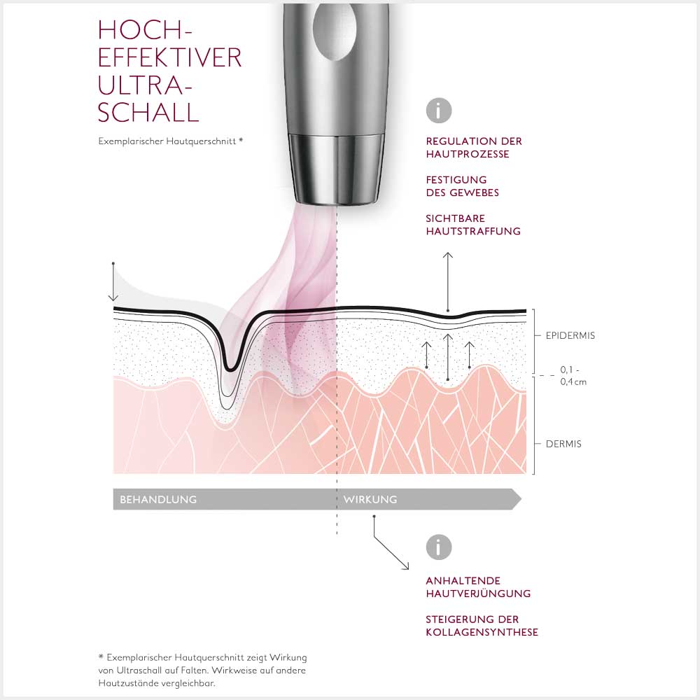 Hochfrequente Ultraschall-Technologie festigt Ihr Gewebe und strafft Ihre Haut sichtbar. Mit jeder Behandlung sehen Sie jünger und frischer aus.