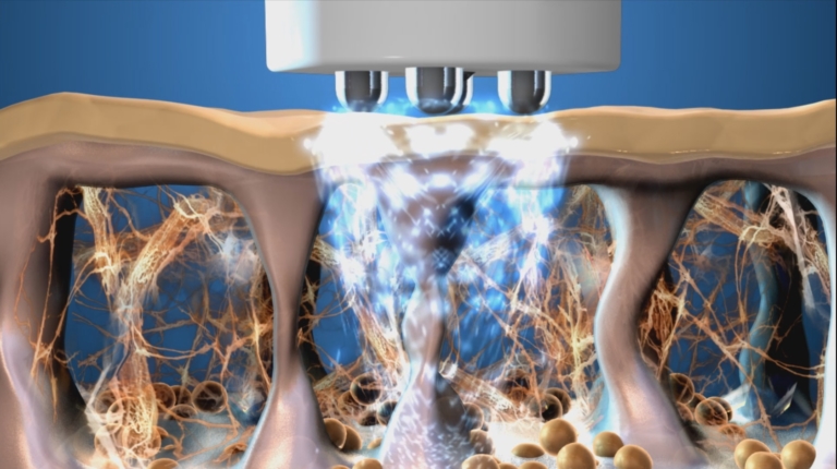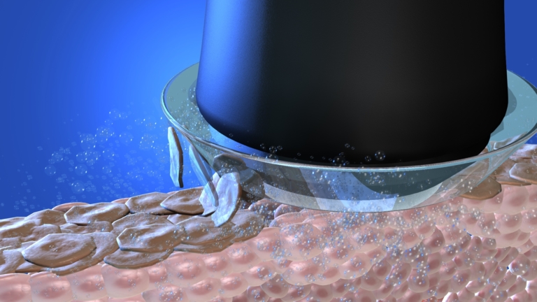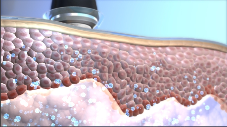 Ultraschall sind extrem schnelle Schwingungen, mit der Aufgabe für sehr kurze Zeit kleine Zwischenräume zwischen den Hautzellen zu öffnen, um so Wirkstoffe und Seren die man auf die Haut aufträgt, optimiert in die Haut einarbeiten zu können.